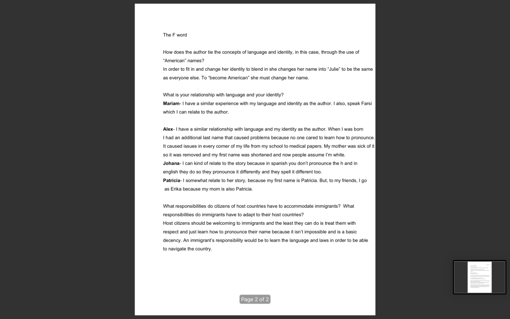 This was a great way to interact with different students in our class. It gave us the ability to look over each other’s answers and be able to ask why you came upon this answer which allowed us to get the exact meaning of why they said it. Doing this in our Writing 001 class, helped me forcefully answer questions in complete sentences to be able to make sense to others. It also made me explain why I put that as my answer.