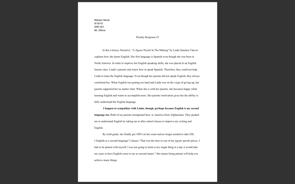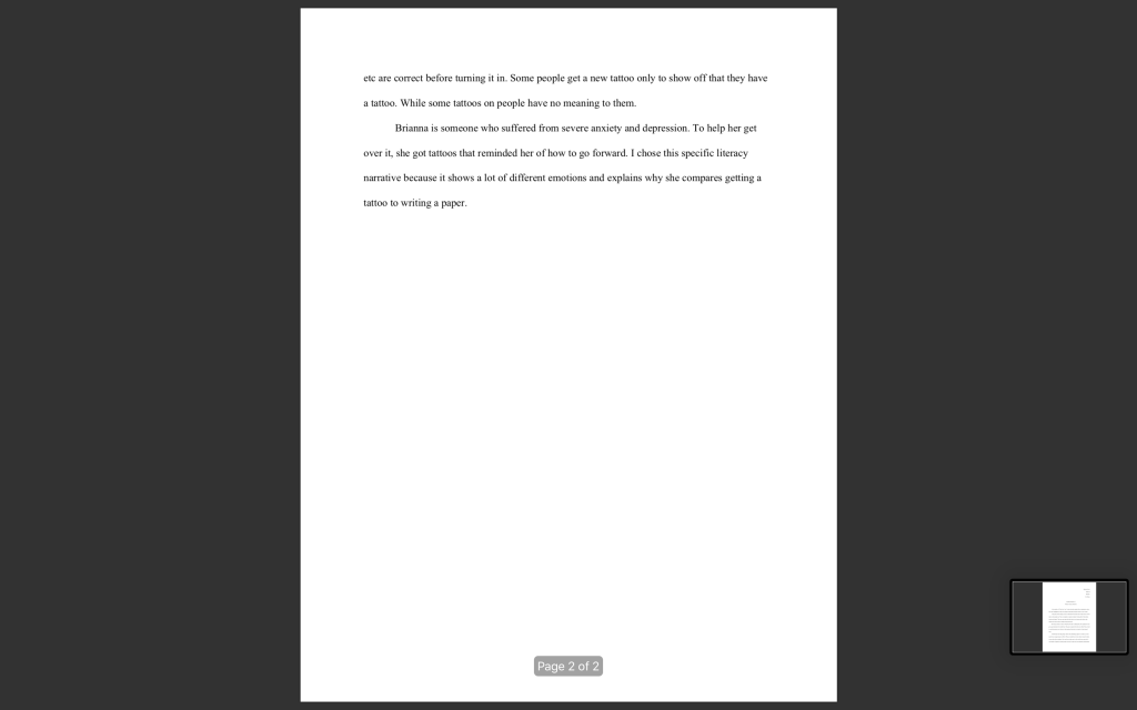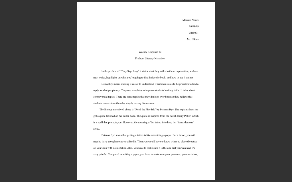 From my perspective, my rhetoric is very different from everyone around me. For example, my second weekly response in that class. In this assignment, I had to choose and summarize a literacy narrative. The literacy narrative I chose was “Read The Fine Ink” by Brianna Bye. I had to explain why she wrote this literacy narrative. I made sure as I was writing the weekly response to not use any first-person narrative. It wasn’t my literacy narrative to summarize it was some else’s so I had to use the third-person narrative.