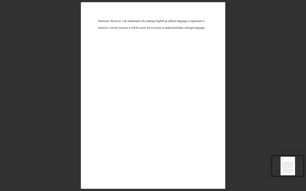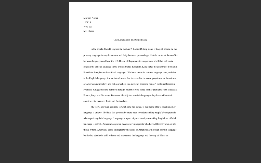 In another example, I had to summarize and explain from my point of view on why should we agree or disagree. The article we were given was “Should English Be The Law?” which was about if English should be a primary language in a daily business proceeding. I was able to utilize rhetoric to give me the ability to demonstrate how I should disagree or agree with English becoming a primary language. I explained that English like any other language is unique. I go on by explaining that there’s no America without its immigrants. Immigrants bring in a new tradition, a different view of life, and a beautiful language. Downsize to coming I said, immigrants had to obtain a new language to understand what was being said around them and to move forward in life. This was important because I had firsthand experience with this. I used my parent’s experiences to influence my ability to explain my point of view. Being in this Writing 001 class has given me exposure to many different types of things. It also gave me a new way to write by using templates from the book “They say, I say.” This helped me to form persuasive sentences and had improved my writing skills.